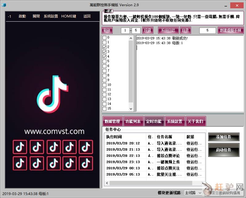 抖音群控无手机版本震撼来袭,2019年3月24号无手机版正式上线,全新开发,软件支持一键操作100的抖音账号,只要硬盘容量允许,操作10000个抖音都是可以的,功能强大,软件自带抖音一键上传通信录,一键清空通信录,一键批量自动点赞,一键批量自动关注,一键批量自动评论,一键批量自动上传视频,一键快速启动抖音,一键快速修改抖音头像,一键快速修改抖音昵称,一键快速修改抖音个性签名,一键批量快速关闭抖音,一键创建模拟手机,自动更换VPN,软件个性化设置,定时功能,查看系统日志,一键分段选择等等,横扫一切同行软件,......赶+驴+网